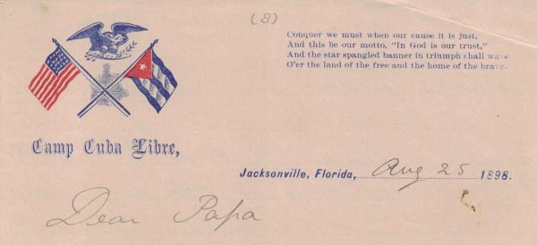 Letter 1: [The letter is written on stationery that has a Camp Cuba Libre letterhead, with crossed U.S. and Cuban flags below an eagle. The letterhead has a bit of poetry as part of the letterhead which reads as follows: